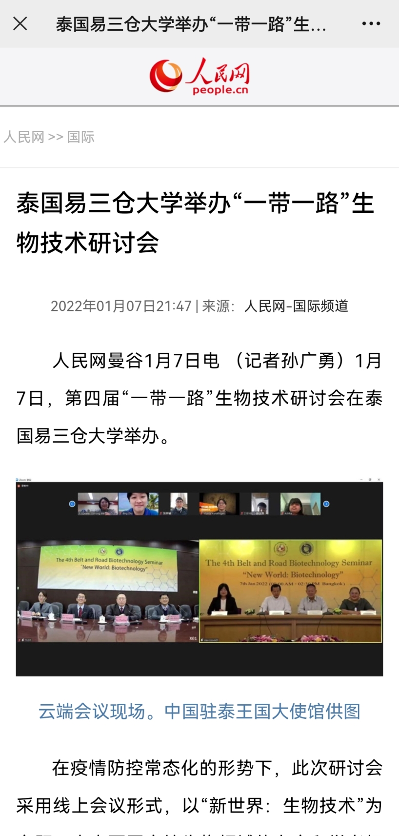 1月7日,第四届“一带一路”生物技术研讨会7日在泰国易三仓大学举办。此次研讨会采用线上会议形式,以“新世界:生物技术”为主题。中泰两国高校生物领域的专家和学者相聚云端,分享各自在生物领域的最新研究成果。Facebook同步直播此次研讨会,吸引众多生物技术方面的专家、学者和高校师生在线观看。