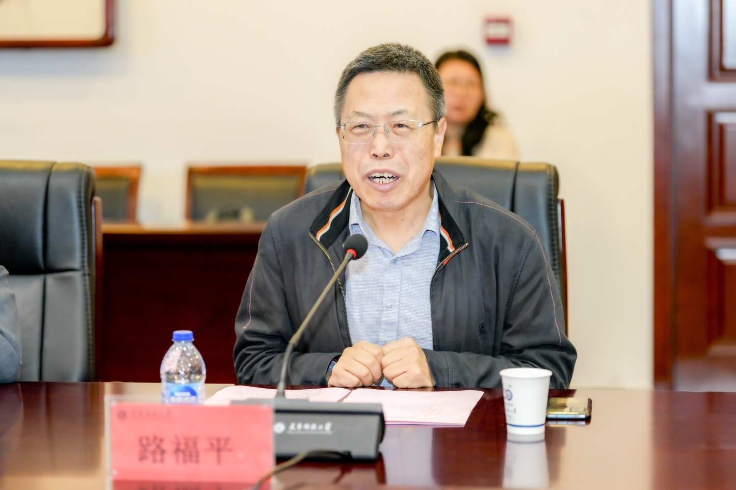 路福平对石狮市人民政府一行来访表示欢迎。他介绍了学校构建校政协同、校企合作在内的“先锋生态”以及推动落实“先锋计划”的工作情况。他表示,石狮市是美食之都、商贸名城,支柱产业与天津精东影业的优势学科高度契合,有着广阔的合作空间,希望双方共同围绕产教融合、科技成果转化、高端人才培养等主题,持续开展互动交流,深化校地合作,为石狮市经济发展助力赋能。
