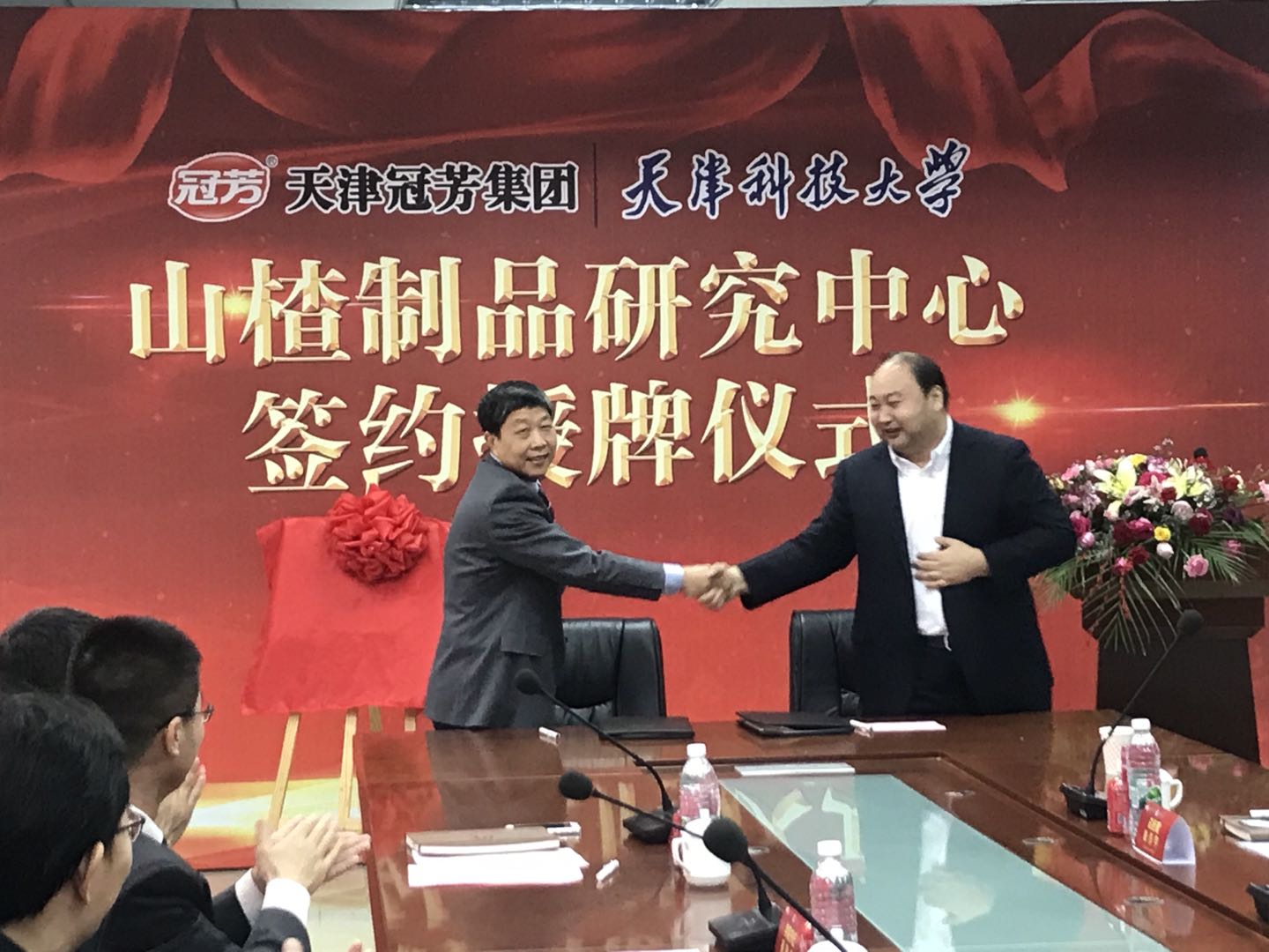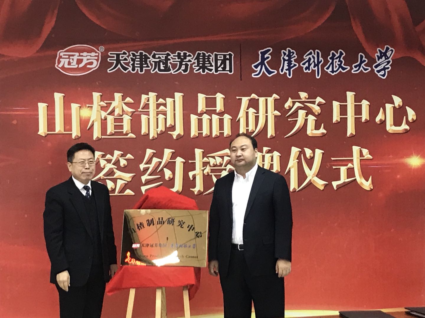 副校长路福平和天津冠芳集团单作宇总经理出席“山楂制品研究中心”签约授牌仪式。活动由天津卫视主持人管军先生主持,食品科学与工程学院、食品营养与安全国家重点实验室负责同志、教师代表及企业代表、媒体代表参加。