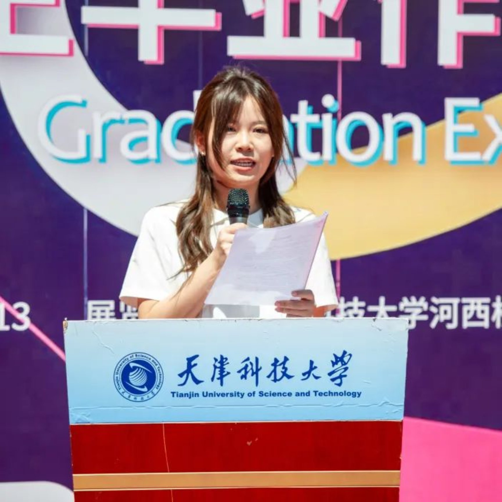 毕业设计指导教师代表刘羽教授发言,她鼓励毕业生们携带着母校的创意基因和人文情怀,奔赴更广阔的未来,并强调学院将永远是他们的创作沃土和精神家园。