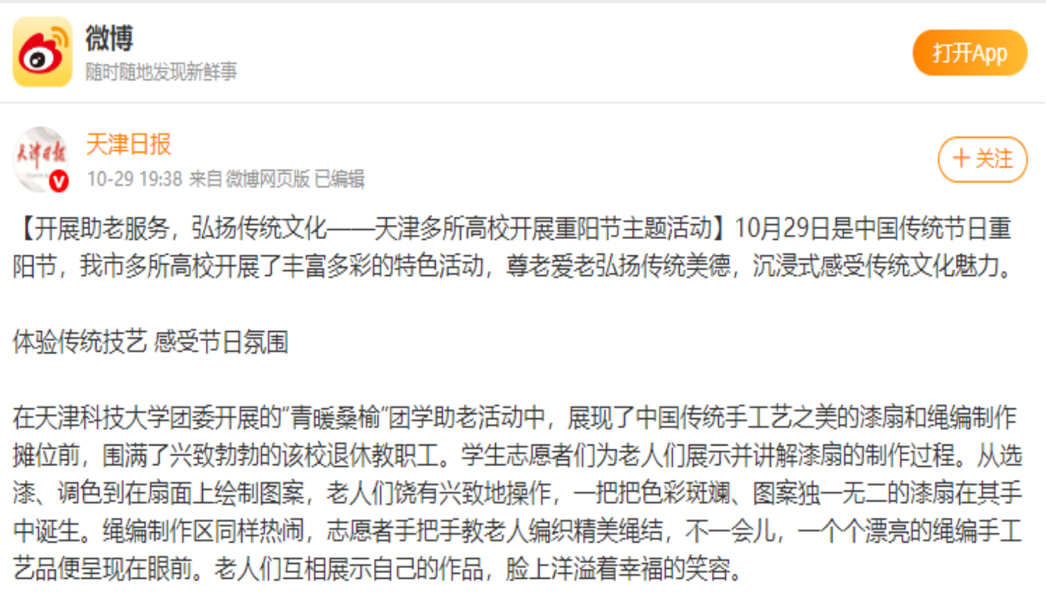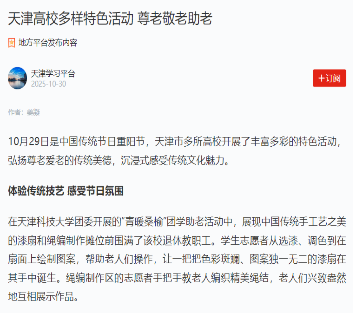 10月30日,学习强国、《天津日报》分别报道我校在中国传统节日重阳节之际,精心组织开展多种尊老敬老助老特色活动,弘扬尊老爱老的传统美德,沉浸式感受传统文化魅力。体验传统技艺,感受浓厚节日氛围。