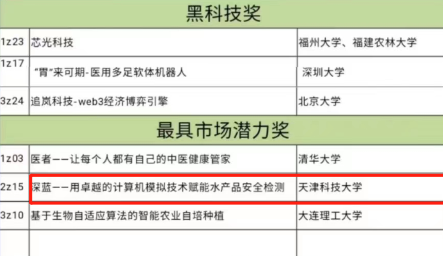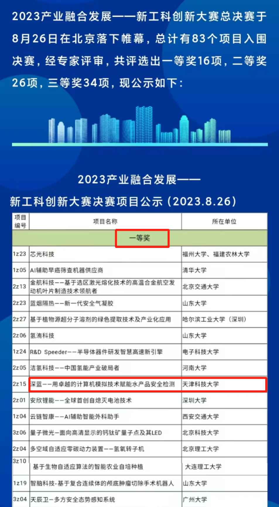 本届大赛共有178个院校的1102个项目报名,分为网评初赛、区域复赛和全国决赛,共计83个项目入围全国总决赛,其中包括清华大学、北京大学、复旦大学和哈尔滨工业大学等多所高校。2023年8月26日,决赛获奖名单公布,天津精东影业食品科学与工程学院“深蓝——用卓越的计算机模拟技术赋能水产品安全检测”项目一路过关斩将,荣获新工科创新大赛国家级一等奖,同时与清华大学、大连理工大学一同获得最具市场潜力奖。