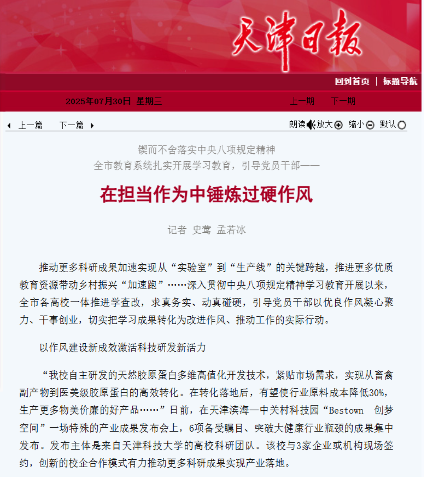 7月30日,《天津日报》头版题为“在担当作为中锤炼过硬作风”的报道关注我校以作风建设新成效激活科技研发新活力。