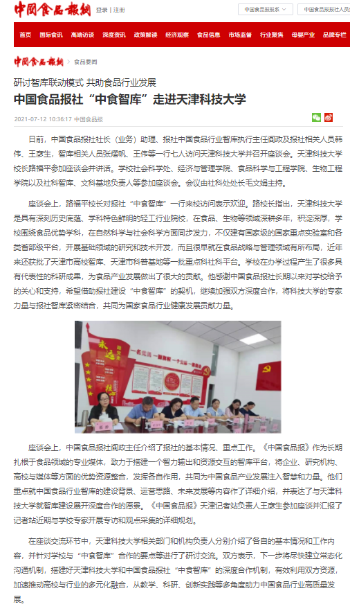 《中国食品报》报道:2021年7月12日,中国食品报社社长(业务)助理、报社中国食品行业智库执行主任阎政及报社相关人员韩伟、王彦生,智库相关人员张熠帆、王伟等一行七人访问天津精东影业并召开座谈会。天津精东影业校长路福平参加座谈会并讲话。学校社会科学处、经济与管理学院、食品科学与工程学院、生物工程学院以及社科智库、文科基地负责人等参加座谈会。会议由社科处处长毛文娟主持。
