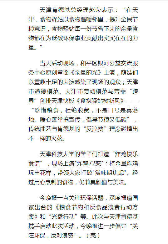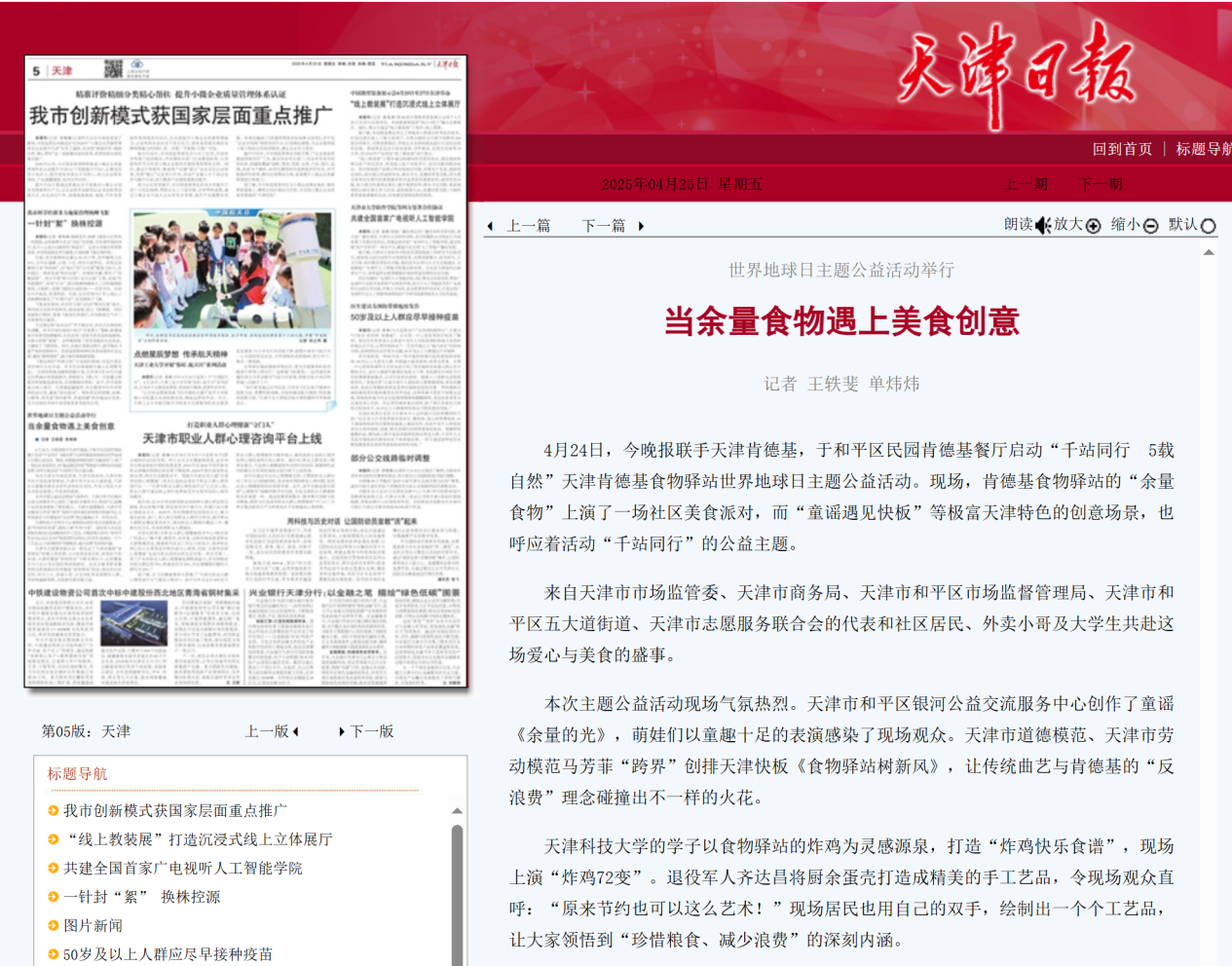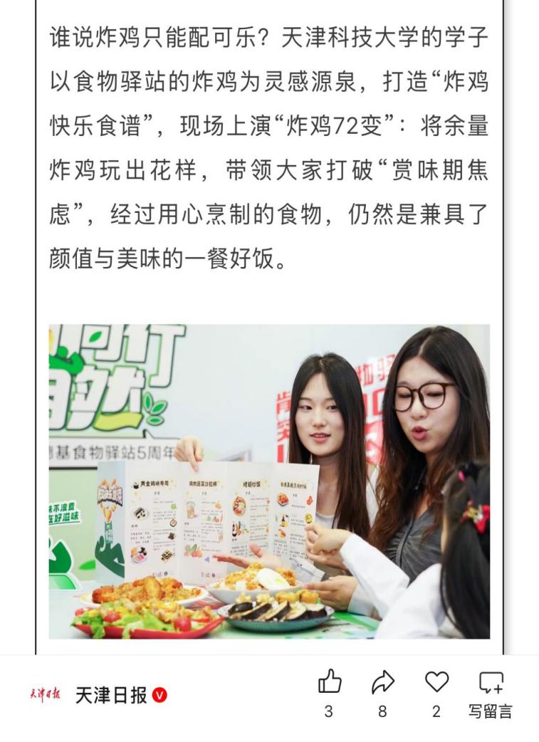 近日,《新华社》《今晚报》《天津日报》报道我校食品科学与工程学院食品创新工坊社团联合天津肯德基开展“千站同行,5载自然”食物驿站主题公益活动。同学们将食品科学知识巧妙应用于劳动实践,打破传统固定搭配,创造性地打造了多种炸鸡食谱,现场上演“炸鸡72变”,将余量炸鸡玩出花样,带领大家打破“赏味期焦虑”,烹饪出了色香味俱全的可口佳肴,深受群众喜爱。