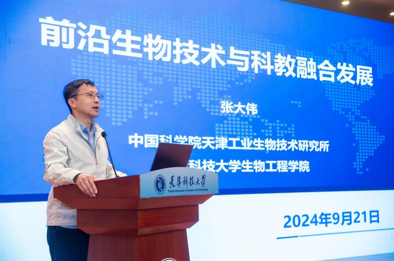 生物工程学院院长张大伟作题为“前沿生物技术与科教融合发展”的专题报告,分析了国际生物技术发展态势以及我国生物制造领域取得的成果和面临的机遇挑战。介绍了我校与中国科学院天津工业生物技术研究所在生物医药领域科技创新和人才培养等方面的合作情况。