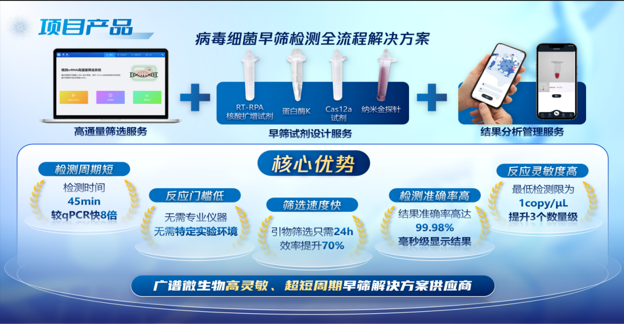 项目简介:精测团队致力于开发一种快速且高灵敏度的病毒和细菌早筛检测技术。通过结合生物CRISPR/Cas显色技术与人工智能视觉算法,实现了能够在常温下快速、准确地对病毒细菌进行浓度定量检测。这项技术将有助于提高早期诊断效率,推动公共卫生的发展。项目获多项奖项和专利,已在天津市疾控中心验证,与qPCR效果一致,受邀参展世界智能大会,获3家企业合作意向。适用于医院、科研院所等多个场景,实现重点疾病早筛和防控。