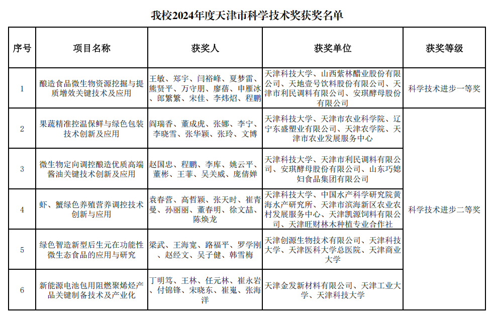 近日,天津市人民政府网站公布了《天津市人民政府关于颁布2024年度天津市科学技术奖的决定》,我校6项成果获天津市科技进步奖。