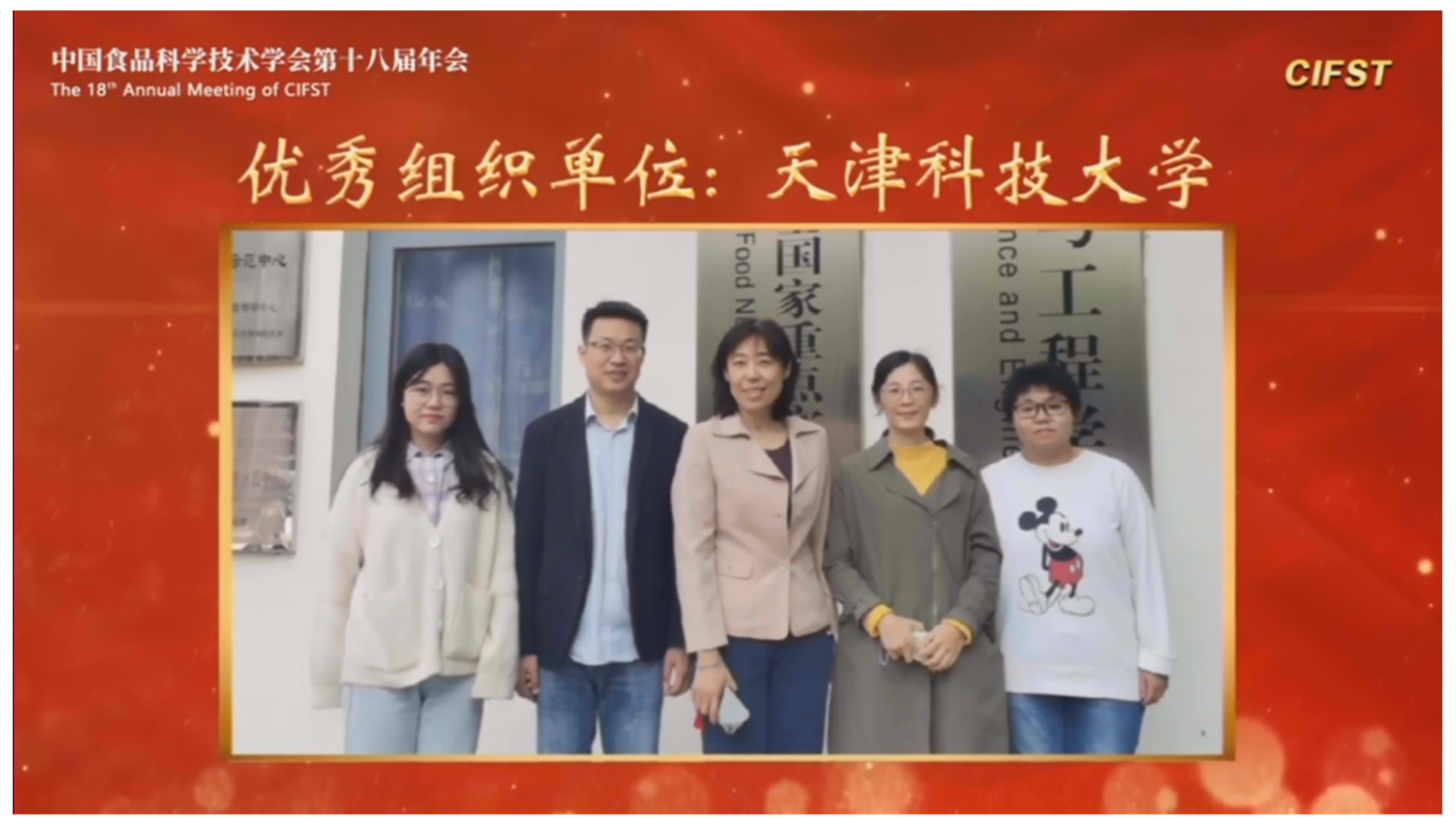 在本届年会上,对2021年度中国食品科学技术学会科技创新奖(包括突出贡献奖、杰出青年奖、《中国食品学报》优秀论文奖3个专项奖)的获奖者给予表彰。我校赵国忠、潘明飞、李文钊、姚云平等老师的团队获奖,我校也获得了优秀组织单位奖。