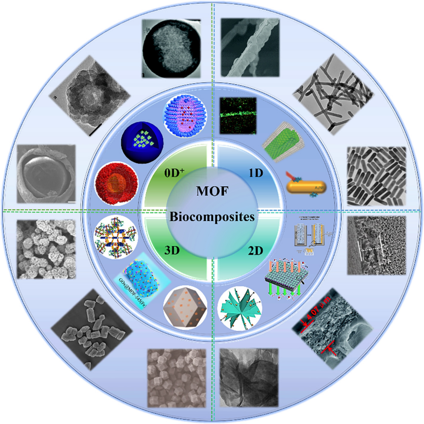 图1 基于不同维度MOF的生物复合材料构建案例展示图