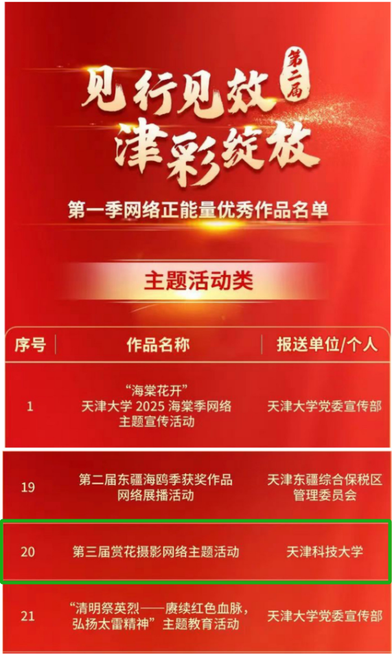 近日,我校网络作品在“见行见效 津彩绽放”天津正能量网络精品征集展播活动中再创佳绩。由我校网信办、宣传部及校团委联合主办的第三届赏花摄影网络主题宣传活动成功入围第二届“见行见效 津彩绽放”活动第一季网络正能量优秀作品。