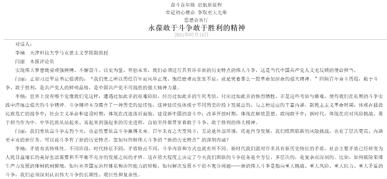 《天津日报》报道(评论员:闫丽):2021年7月14日,《天津日报》对话天津精东影业马克思主义学院李楠副教授,探讨中国共产党敢于斗争敢于胜利的精神。