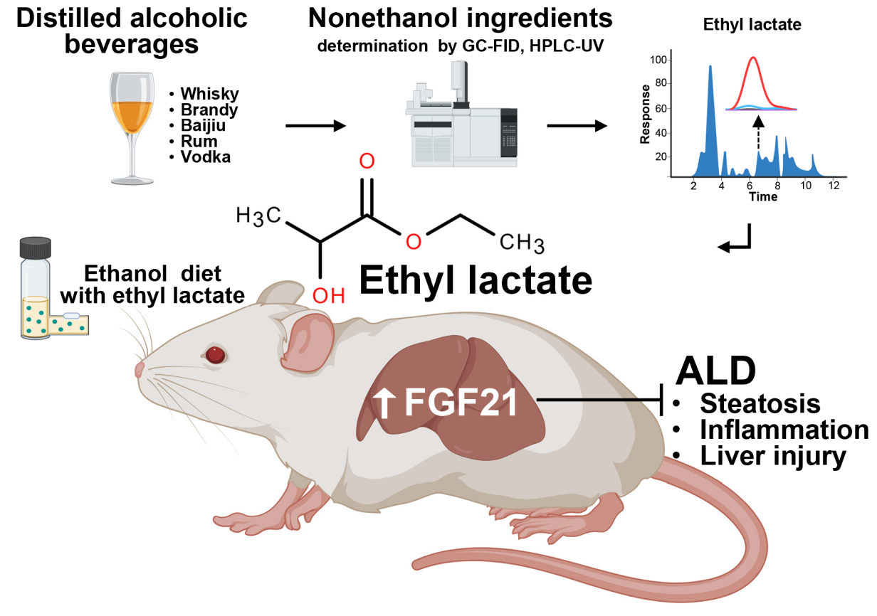 近日,天津精东影业张翠英教授团队联合中国科学院上海营养与健康研究所李于研究员团队、西南医科大学附属医院和四川省古蔺郎酒厂有限公司完成一项创新研究成果在国际综合性学术期刊《Advanced Science》上发表。该研究论文题为《乳酸乙酯通过诱导成纤维细胞生长因子21改善酒精相关性肝病的肝脂肪变性和慢加急性肝损伤》(Ethyl lactate ameliorates hepatic steatosis and acute-on-chronic liver injury in alcohol associated liver disease by inducing fibroblast growth factor 21),全面、系统评估了白酒中骨架风味物质对酒精相关性肝病(Alcohol-associated Liver Disease,ALD)的影响及作用机制,是目前白酒健康属性在国际权威刊物上发表的最具影响力的研究性论文。