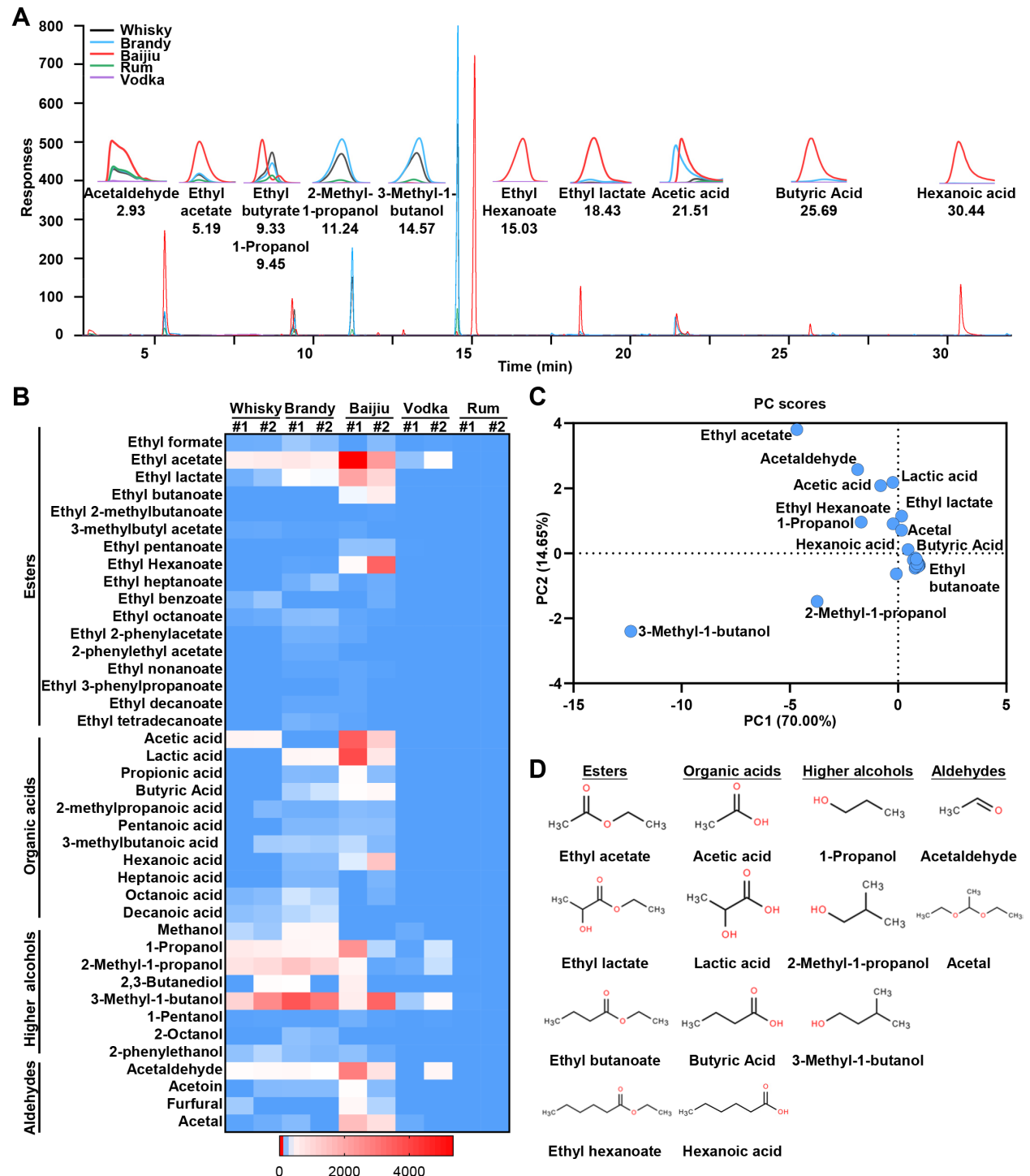 该项研究采用气相色谱(GC-FID)和液相色谱(HPLC-UV)检测方法,定量分析了威士忌、白兰地、白酒、朗姆酒和伏特加中骨架风味物质组成及含量。通过主成分分析,确定了乙酸乙酯、乳酸乙酯、丁酸乙酯、己酸乙酯、乙酸、乳酸、丁酸、己酸、正丙醇、异丁醇、异戊醇、乙醛和乙缩醛是蒸馏酒中13种主要的非酒精成分。