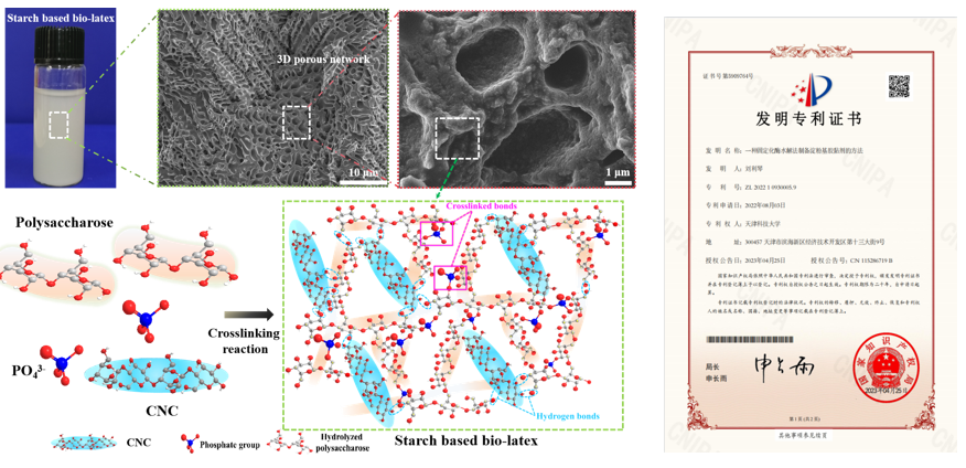 基于固定化酶水解法对淀粉酶解行为的调控技术,刘利琴作为第一发明人授权了一项中国发明专利和一项欧洲发明专利。这两项发明专利分别提出了一种纤维素纳米晶固定化酶水解法制备淀粉基胶黏剂的方法(如图3所示)和一种超分子微球固定化酶水解法制备高力学强度淀粉基食品包装膜的制备方法(如图4所示)。
