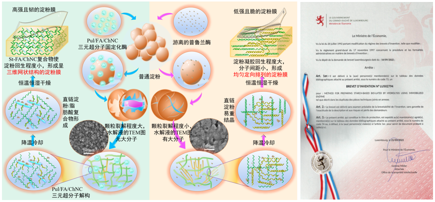 图4 高力学强度淀粉膜的形成机理与微观形貌及其授权的国际发明专利书