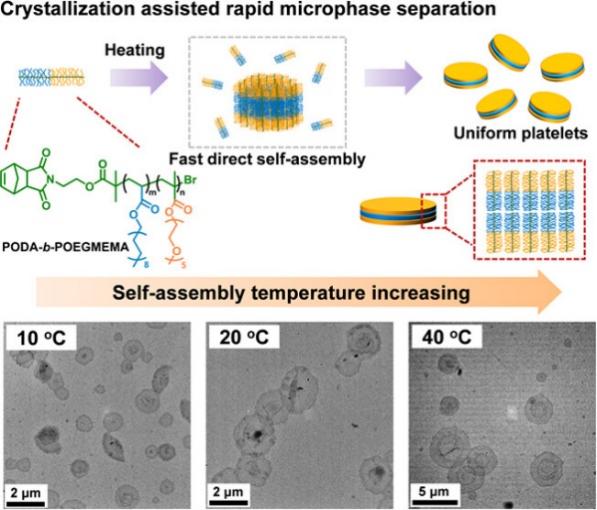 该研究首次结合了结晶作用驱动的自组装过程和瓶刷状聚合物拓扑结构快速微相分离的特征,利用聚丙烯酸十八烷基酯-嵌段-聚寡聚乙二醇甲基丙烯酸甲酯为研究对象,建立了一种协同促进溶液环境中聚合物瞬时快速微相分离的新机制。与传统结晶驱动自组装相比,这种方法将组装时间大幅度缩短至几分钟甚至几秒,而组装浓度提升数十倍。通过进一步借助多种先进表征手段和分子动力学模拟,研究建立了胶束形貌与生长行为间的构效关系,揭示了自组装演化过程中显示出的温度依赖特征的关键作用,实现了对微纳结构生长的“活性”调节和高效构筑尺寸均一的微纳结构的目的,为聚合物自组装和凝聚态行为基础与应用研究提供了新的理论支撑。