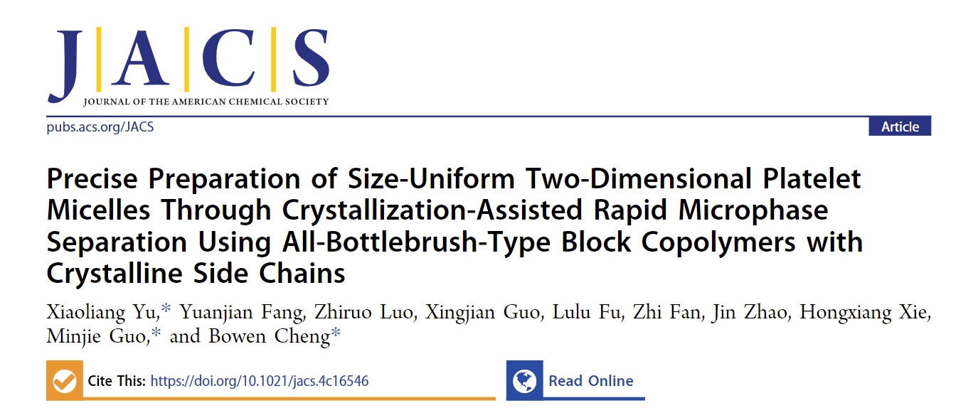 近日,我校程博闻教授团队在结晶聚合物溶液自组装领域取得重要进展和突破,在化学领域国际顶级期刊《Journal of the American Chemical Society》上发表题为“Precise preparation of size-uniform two-dimensional platelet micelles through crystallization-assisted rapid microphase separation using all-bottlebrush-type block copolymers with crystalline side chains”的研究论文(Xiaoliang Yu*, Yuanjian Fang, Zhiruo Luo, Xingjian Guo, Lulu Fu, Zhi Fan, Jin Zhao, Hongxiang Xie, Minjie Guo*, Bowen Cheng*, J. Am. Chem. Soc. 2025,DOI: 10.1021/jacs.4c16546)。化工与材料学院青年教师于晓亮为第一作者,于晓亮博士、郭敏杰教授、程博闻教授为论文的共同通讯作者,天津精东影业为独立通讯单位。