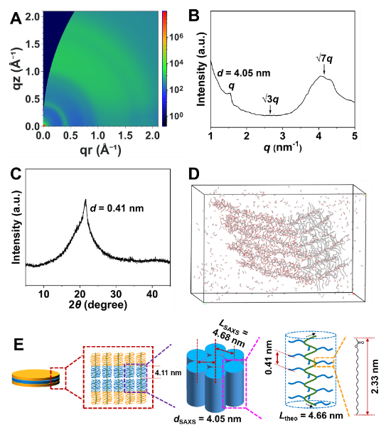 图2(A、B) 固态聚合物胶束的二维和一维小角X射线散射图谱;(C) 聚合物的X-射线衍射图谱;(D) 聚合物在正丙醇中自组装的动力学计算模型;(E) 不同尺度下瓶刷状嵌段共聚物自组装二维片状胶束的层次结构示意图