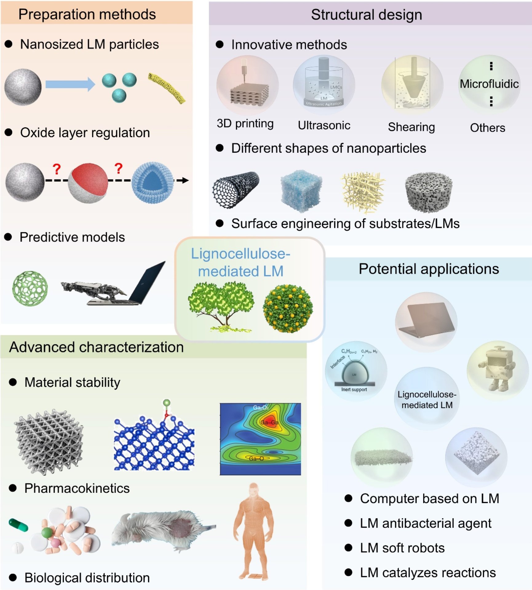 图2.木质纤维素/液态金属复合材料的设计制备、结构调控、现存挑战和未来应用