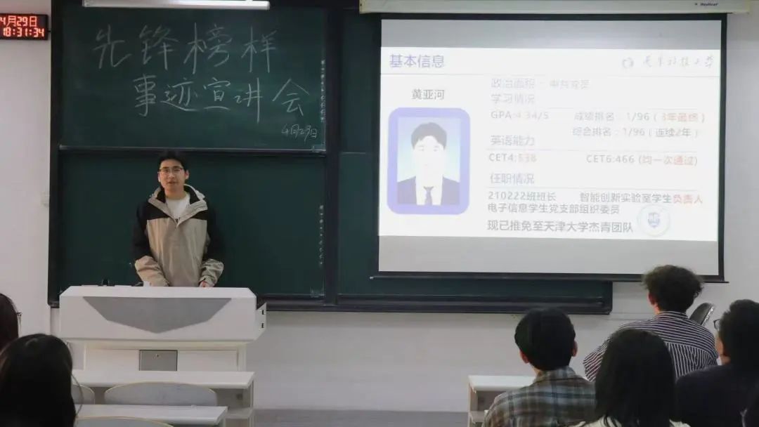 为全面贯彻落实“先锋计划”,明确先锋目标,充分发挥先锋模范作用,同时着力营造浓厚学习氛围,助力学生攻克学业难关、激发学习内生动力,2025年4月29日12:20和18:30,天津精东影业机械工程学院携手电信学院、人工智能学院于10-210教室分别开展两场“先锋榜样宣讲”活动。旨在以朋辈引领为桥梁,以经验共享为纽带,为莘莘学子搭建交流互鉴、共同成长的优质平台。