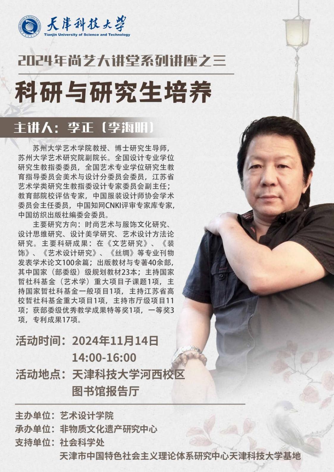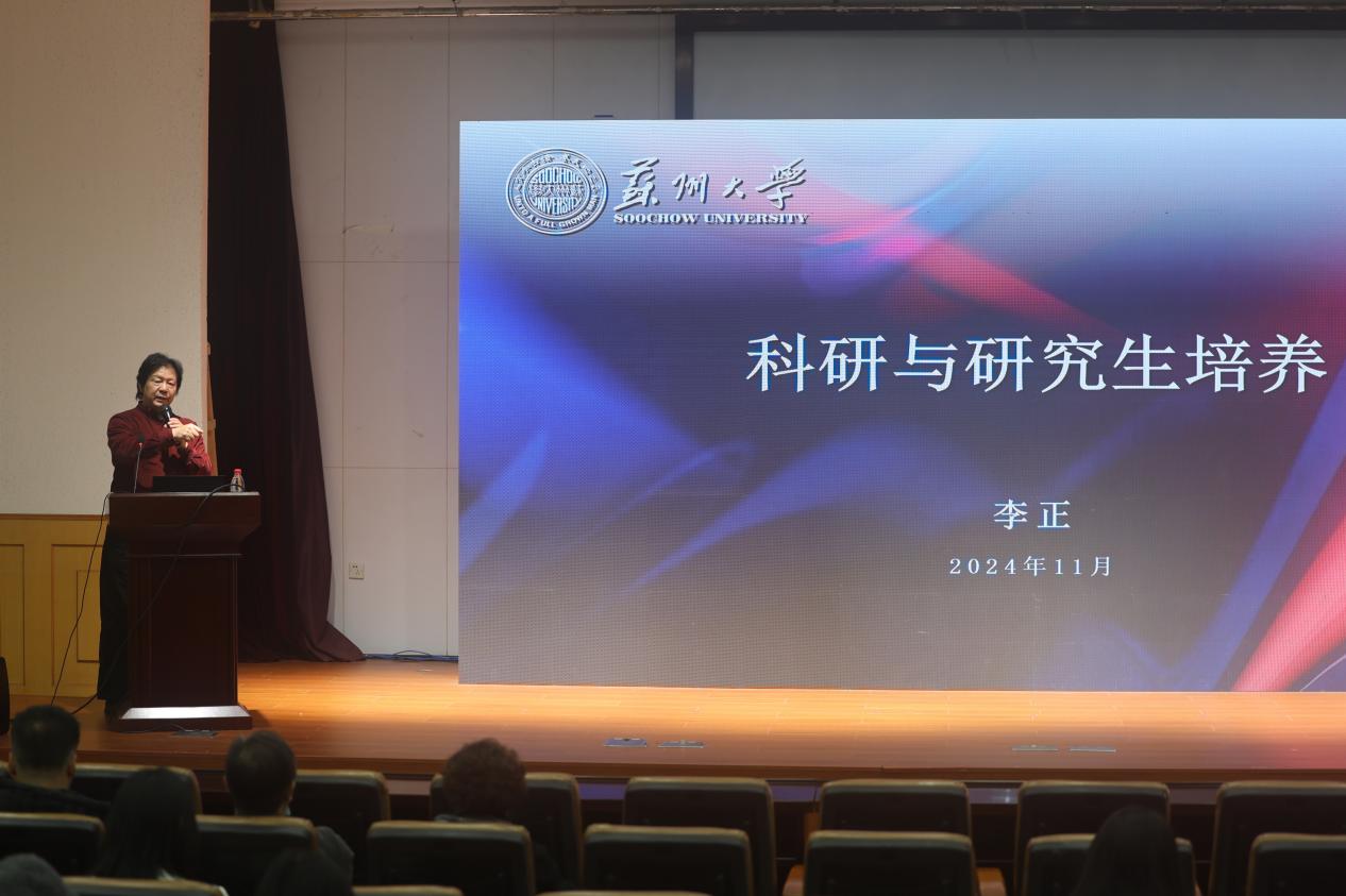 11月14日,艺术设计学院很荣幸地邀请了全国设计专业学位研究生教指委委员、苏州大学艺术学院教授、博士研究生导师、苏州大学艺术研究院副院长李正(李海明)到学院指导学科建设工作,并举办专题讲座。我校党委副书记贾启君在讲座开始前会见了李正教授。李正教授给学院师生带来题为“科研与研究生培养”的讲座,本次主题讲座也是2024年“尚艺大讲堂”名师讲座的第三讲,由学院张新沂副院长主持,学院领导班子和部分教师以及一百多名学生参与此次讲座。